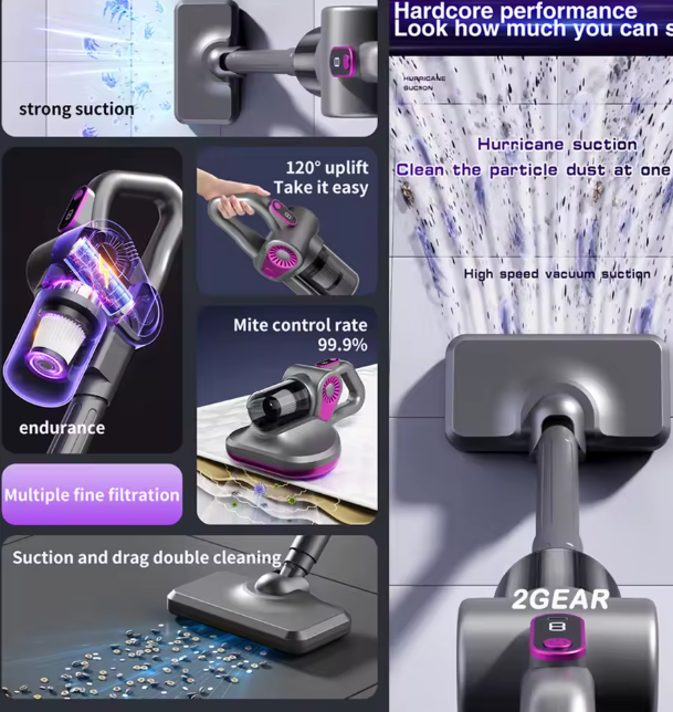 Sistema Multifunción 4 en 1: Actúa como aspiradora vertical, de mano, para alfombras y eliminadora de ácaros, reemplazando múltiples herramientas de limpieza con un solo dispositivo.